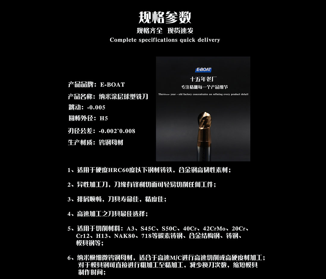 6、納米極細微鎢鋼母材,適合于高速M/C進行高速切削或高硬度材加工;對于模具鋼可直接進行粗加工至精加工,減少換刀次數(shù),縮短模具制作時間;